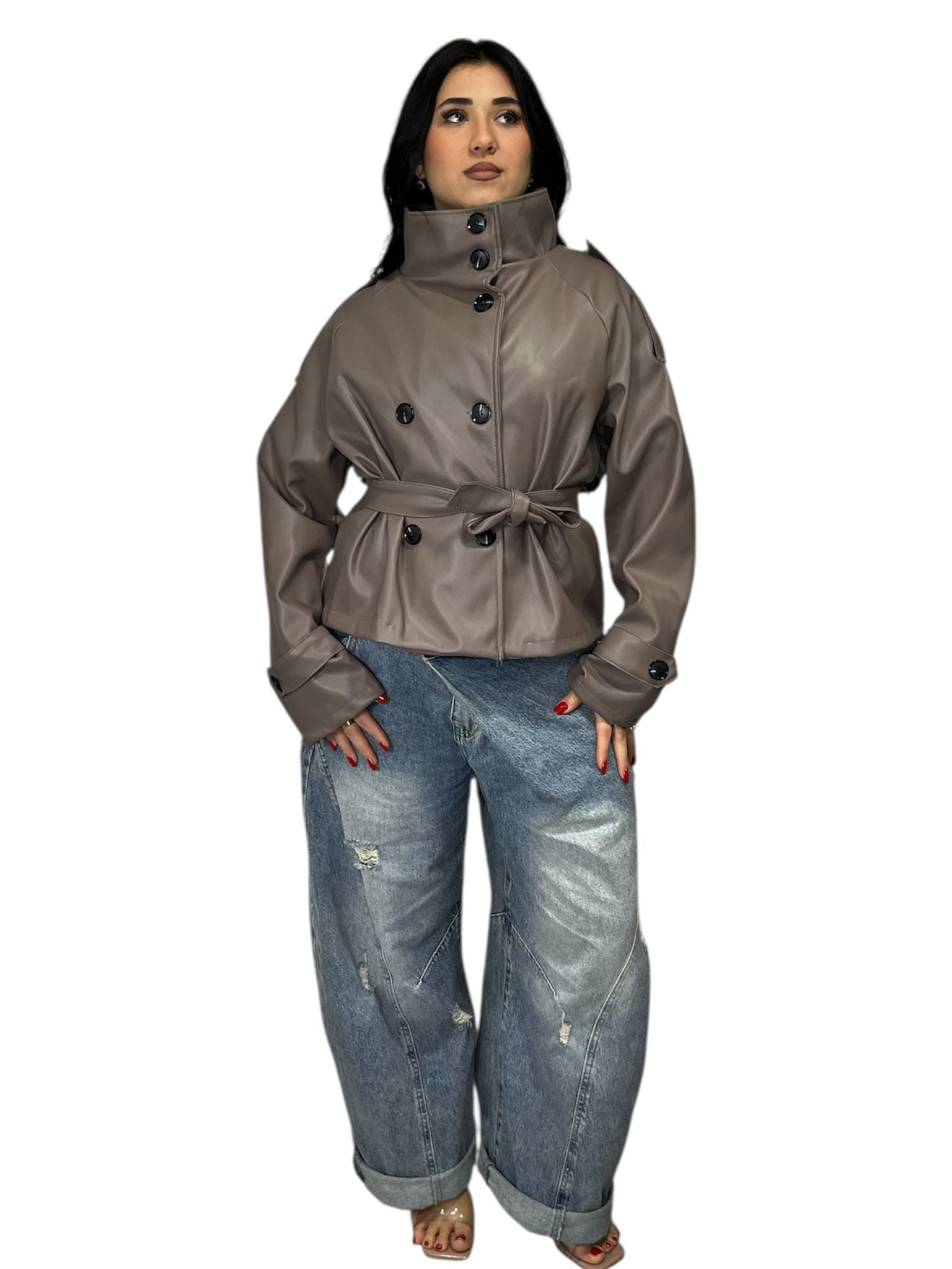 Trench Chris realizzato in ecopelle, un materiale sostenibile e resistente che combina stile e praticità. Il capo presenta bottoncini che garantiscono una chiusura sicura e un look classico e versatile. La taglia unica si adatta a diverse morfologie, rendendolo una scelta pratica per chi cerca un capospalla elegante e funzionale. Perfetto per creare outfit sofisticati in qualsiasi stagione, il trench Chris è un pezzo essenziale da avere nel guardaroba.